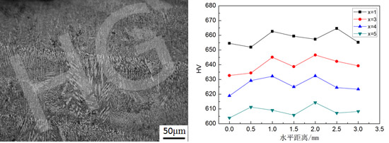 通過對(duì)高速激光熔覆層的顯微組織進(jìn)行金相及硬度分析,可以看出高速激光熔覆獲得的顯微組織晶粒更加細(xì)小,晶粒越細(xì)化,性能越優(yōu)良。熔覆層的硬度也可根據(jù)具體要求進(jìn)行成分配比的調(diào)整,且硬度均勻,適用于各種硬度需求。