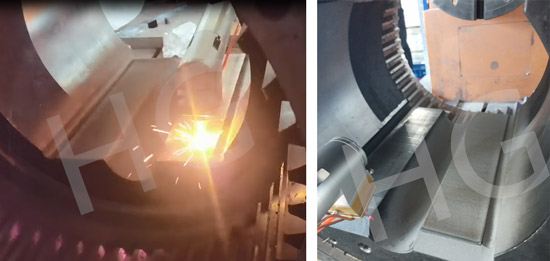 內(nèi)壁激光熔覆主要用于零件內(nèi)孔或內(nèi)壁的耐磨、耐蝕涂層制備或修復(fù)。我司針對(duì)某重要客戶的產(chǎn)品類型,研制了一套更為合理優(yōu)秀的加工方案,對(duì)傳統(tǒng)內(nèi)孔修復(fù)技術(shù)實(shí)現(xiàn)再升級(jí)——內(nèi)孔高速激光熔覆。該技術(shù)可實(shí)現(xiàn)直徑120mm以上內(nèi)孔連續(xù)加工作業(yè),結(jié)合高速熔覆技術(shù)將加工效率提升至原來的2-10倍,實(shí)現(xiàn)了高效率內(nèi)壁處理,特別適用于薄壁的處理及變形量要求高的產(chǎn)品。同時(shí),熔覆層厚度靈活可控,可根據(jù)實(shí)際需要進(jìn)行調(diào)整。