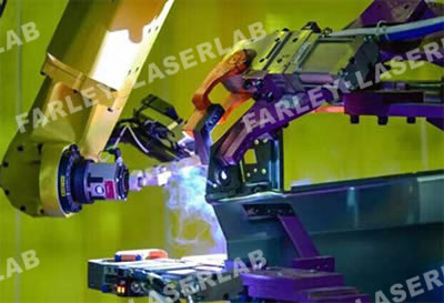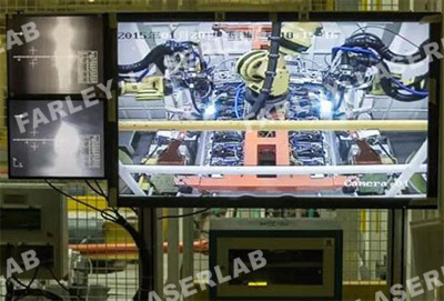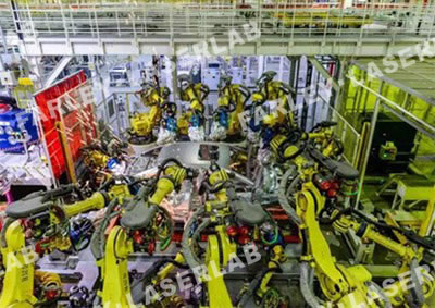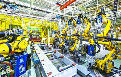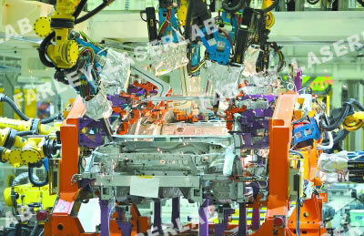 在車身車間,機器人正在進(jìn)行總拼增焊工序,該車間擁有452臺機器人,自動化率高達(dá)97%