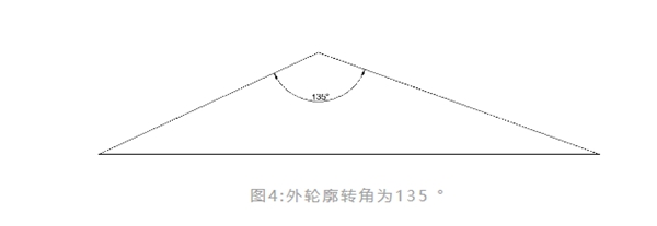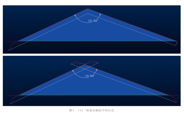當(dāng)轉(zhuǎn)角是鈍角或是超過(guò)一定角度(這個(gè)角度在編程軟件里可設(shè)置)的時(shí)候,切割頭可以直接通過(guò)旋轉(zhuǎn)達(dá)到相鄰線段所需角度。如圖4所示,對(duì)于135 °的外輪廓,當(dāng)我們?cè)谲浖锩嬖O(shè)置好轉(zhuǎn)角回路閾值,在出程序時(shí),就可以決定我們是直接成型,還是重新打孔加引線兩次成型。