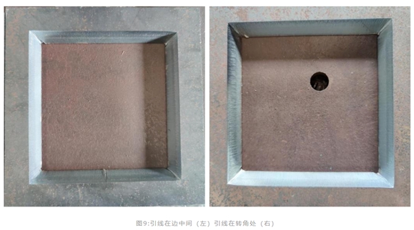 在實(shí)際切割過(guò)程中,內(nèi)輪廓的轉(zhuǎn)角處切割頭可以快速轉(zhuǎn)到相鄰邊所需角度,切割過(guò)程中,保證每個(gè)邊的坡口角度一致,并且轉(zhuǎn)角處成型良好。圖9為10mm鐵板內(nèi)輪廓轉(zhuǎn)角切換狀態(tài),將引入線放到內(nèi)輪廓轉(zhuǎn)角處,可以看到內(nèi)輪廓4邊坡口角度一樣且切割面質(zhì)量更好,無(wú)引線痕跡。