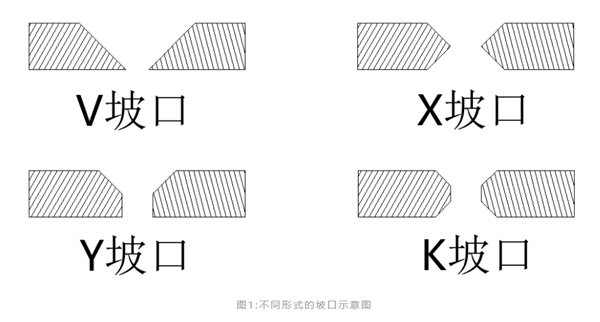 根據(jù)材料厚度和焊接質(zhì)量需求,市面上主要的坡口形式有V型坡口、Y型坡口、X型坡口、K型坡口,如圖1所示。V坡口和Y坡口是單面焊接,切割和后期焊接過(guò)程都較為便利,缺點(diǎn)是焊后容易變形。當(dāng)焊件厚度增大時(shí),一般采用X坡口或K坡口,同樣厚度下可減少焊縫金屬量約1/2,對(duì)稱施焊,焊后變形小,缺點(diǎn)是焊接過(guò)程中要翻轉(zhuǎn)焊件,在筒形焊件的內(nèi)部施焊,需耗費(fèi)一定的時(shí)間、人力成本。