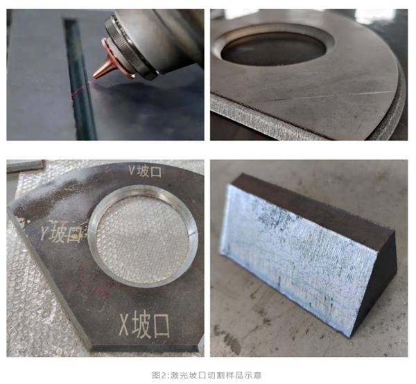 相比以上傳統(tǒng)開(kāi)坡口方式,激光是目前在市場(chǎng)運(yùn)用中熱變形最小,切口質(zhì)量最佳,尺寸精度最高并且穩(wěn)定性最好的一種新型加工方式。目前,國(guó)內(nèi)外已經(jīng)普遍采用激光切割機(jī)完成20mm甚至更厚鋼板的坡口加工,可一次成形V、X、Y等形狀的坡口,將傳統(tǒng)切割、銑削等多道工序流程一次完成,不僅可以大大提高效率、保證質(zhì)量、節(jié)約資源,并且切割零件質(zhì)量、尺寸精度較高,Y、K等形態(tài)坡口留根均勻一致,具有較高的表面質(zhì)量,如圖2所示。