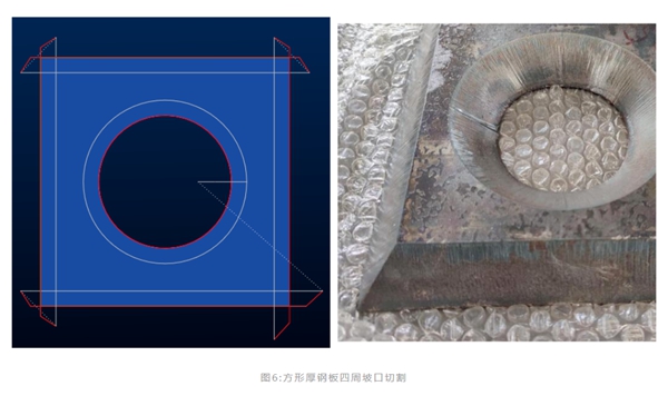 如圖6所示,正方形的4條邊都切割坡口,每條邊都是單獨(dú)打孔然后偏轉(zhuǎn)切割頭。通過(guò)修改軟件中引線參數(shù),我們可以決定轉(zhuǎn)角過(guò)渡時(shí)引入線和引出線的長(zhǎng)度。這種切割方式的好處是轉(zhuǎn)角處切割質(zhì)量好,相鄰邊切割相互獨(dú)立,不會(huì)出現(xiàn)轉(zhuǎn)角燒融的現(xiàn)象。從切割樣件圖片可以看到,25mm鐵板四周坡口轉(zhuǎn)角處的切割質(zhì)量良好,沒(méi)有出現(xiàn)轉(zhuǎn)角過(guò)燒現(xiàn)象。