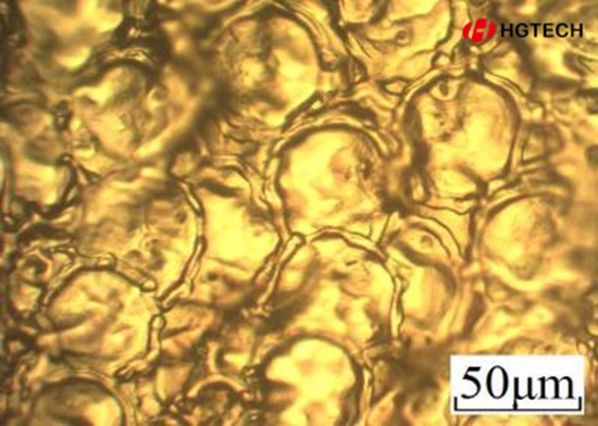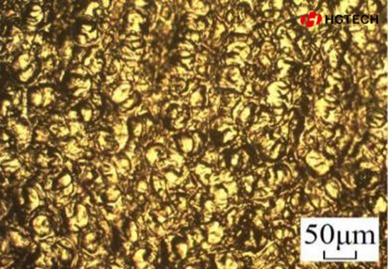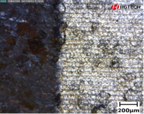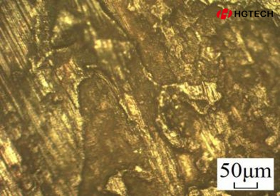 如下圖5,制動盤表面未進行激光清洗前表面被不均勻銹蝕覆蓋,經(jīng)過最佳激光清洗工藝清洗后,基材表面銹蝕被去除,亮斑相互重疊,在表面形成相互重疊的一個個凹坑,將原本銹蝕的區(qū)域清洗干凈。此外,觀察激光清洗后的表面放大500倍,可以看到表面被圓形的亮斑覆蓋形成圓形的清洗區(qū)域,凹坑中部的銹層基本上被清除干凈,并呈現(xiàn)均勻的亮澤。凹坑邊緣部分呈現(xiàn)環(huán)狀凸起形貌,原因是脈沖激光劇烈的沖擊作用下,凹坑中部的金屬流向邊緣處并且堆積起來形成環(huán)狀,相鄰凹坑的環(huán)形部分呈現(xiàn)均勻搭接堆疊,且?guī)缀醪淮嬖阡P斑,表面完全清洗干凈。3.4 表面金相結(jié)構(gòu)分析