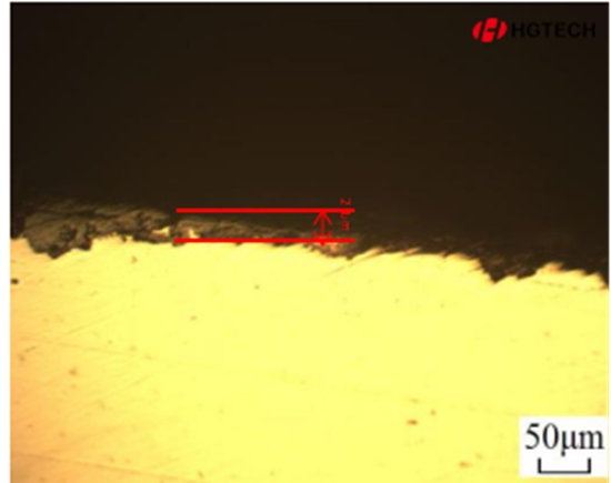 制動盤所用材料為Q345E,根據(jù)國標GB8923-88的標準,對零件銹蝕程度進行判斷,發(fā)現(xiàn)鋼材表面已發(fā)生銹蝕,并且部分氧化皮有銹蝕,因此判斷零件銹蝕等級為B級。經(jīng)多次取平均值,測量得到銹層平均厚度約為23μm(如下圖2)。通過材料表面銹蝕程度分析,發(fā)現(xiàn)表面銹蝕程度不均勻,這是由于制動盤在工作運行中對表面的磨損與銹蝕程度不同造成的。