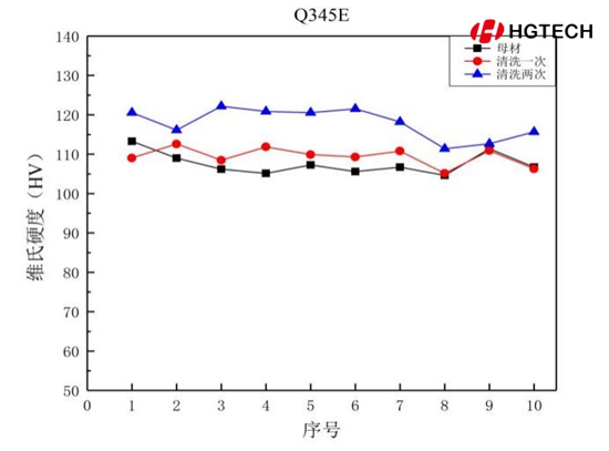 通過清洗前后基材表面硬度值的分布趨勢進行分析。依據(jù)上圖4,清洗后基材表面硬度值分布趨勢較為波動,但是硬度平均值高于母材的硬度值??梢园l(fā)現(xiàn)經(jīng)過激光清洗兩次后的表面顯微硬度與母材相比提高了約8%。激光除銹能提高碳鋼表面的硬度,對防止碳鋼再次氧化和表面強化具有重要意義。