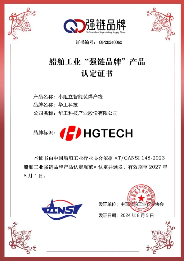 8月8日,中國(guó)船舶工業(yè)行業(yè)協(xié)會(huì)公布2024年度船舶工業(yè)“強(qiáng)鏈品牌”產(chǎn)品認(rèn)定結(jié)果,華工科技申報(bào)的“部件智能切割下料線(xiàn)”和“小組立智能裝焊產(chǎn)線(xiàn)”通過(guò)中國(guó)船舶工業(yè)行業(yè)協(xié)會(huì)的專(zhuān)家團(tuán)隊(duì)審查,被認(rèn)定并列入船舶工業(yè)“強(qiáng)鏈品牌”產(chǎn)品目錄。