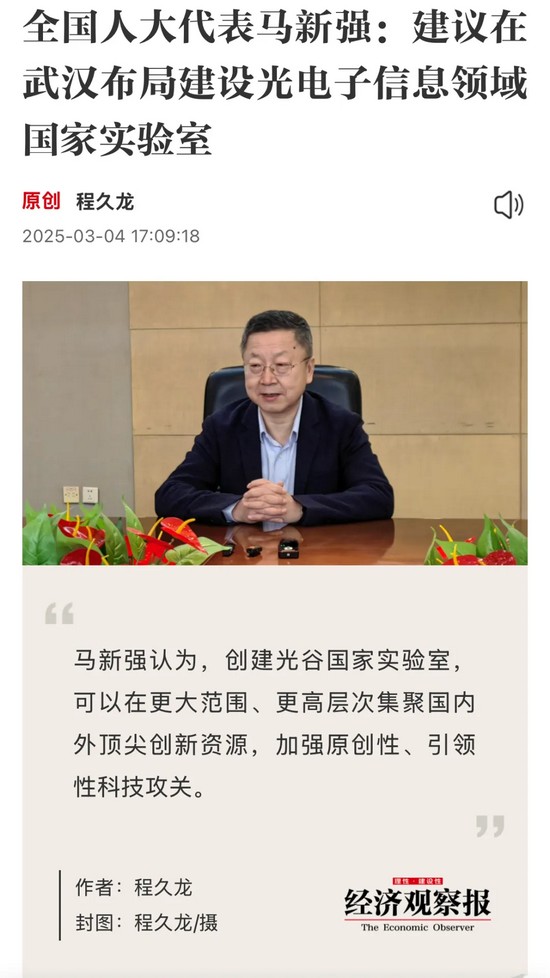 “支持武漢創(chuàng)建光谷國(guó)家實(shí)驗(yàn)室,有利于促進(jìn)創(chuàng)新鏈產(chǎn)業(yè)鏈融合,有利于集中多方優(yōu)勢(shì)資源、盡快實(shí)現(xiàn)關(guān)鍵核心技術(shù)突破,推動(dòng)我國(guó)光電子信息產(chǎn)業(yè)加快發(fā)展?!瘪R新強(qiáng)認(rèn)為,創(chuàng)建光谷國(guó)家實(shí)驗(yàn)室,可以在更大范圍、更高層次集聚國(guó)內(nèi)外頂尖創(chuàng)新資源,加強(qiáng)原創(chuàng)性、引領(lǐng)性科技攻關(guān)。