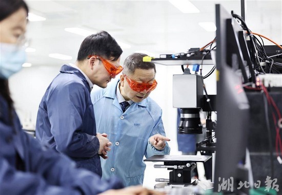 離開車間,馬新強乘車來到實驗室,換好服裝,戴上橙色護目鏡,與研發(fā)人員一起認(rèn)真觀察還在實驗中的高端晶圓激光切割設(shè)備,并不時提出要求。