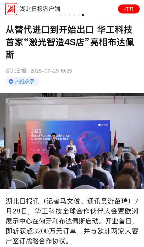 7月29日,華工科技全球合作伙伴大會(huì)暨歐洲展示中心在匈牙利布達(dá)佩斯啟動(dòng)。該中心將汽車4S店的服務(wù)理念引入工業(yè)制造領(lǐng)域,融合展示、銷售、服務(wù)和解決方案四大功能,提供本地化提貨的一站式服務(wù),大幅縮短了歐洲客戶的交付周期和本地服務(wù)響應(yīng)速度,交付周期從幾周甚至幾月,縮短到最快72小時(shí)。會(huì)上,華工科技發(fā)布“全球發(fā)展戰(zhàn)略計(jì)劃”和全球人才計(jì)劃“HERO PLAN”,以及為海外市場(chǎng)升級(jí)打造的全新一代三維五軸激光切割智能裝備。